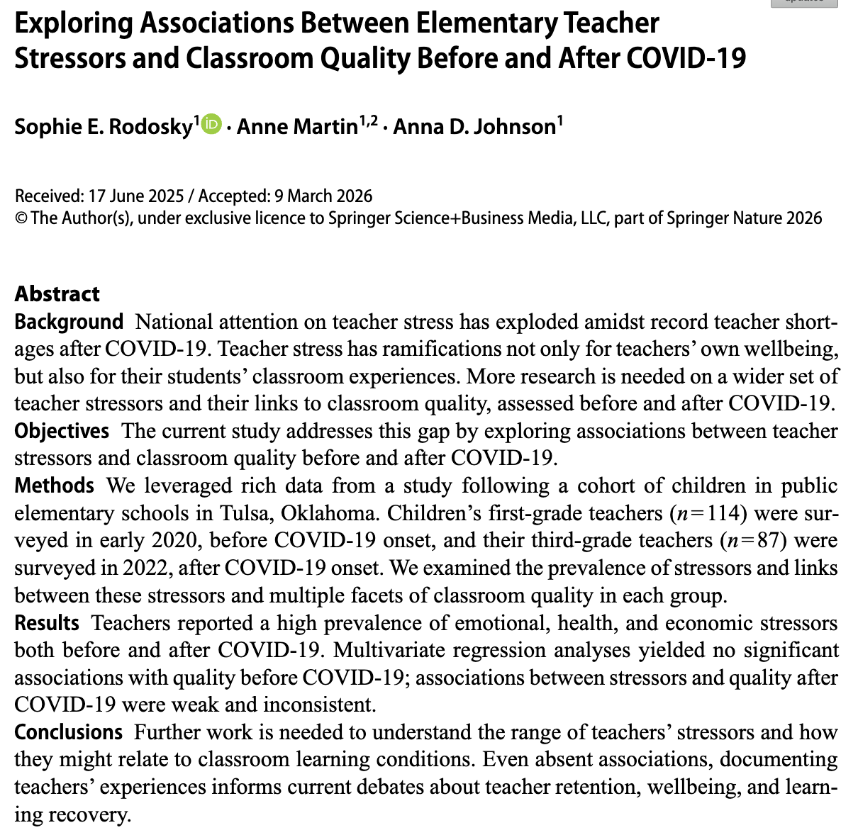 The Tulsa SEED (School Experiences and Early Development) Study is among the nation’s most comprehensive evaluations of public pre-kindergarten. Tulsa SEED has followed a sample of low-income children in publicly-funded pre-k in Tulsa, OK, beginning when children were 3-years-old (2016) and continuing through 9th grade (2028). The study aims to understand the effects of pre-k – administered in a mix of public and charter school-based pre-k classrooms and Head Start and Educare classrooms – on children’s self-regulatory, education, and health outcomes. To accomplish this goal, Tulsa SEED collects comprehensive data, including direct assessments of children’s skills in the fall and spring of each year, teacher and observer reports of child behavior, surveys of children’s parents and teachers, in-depth classroom observations of teacher-child and peer-to-peer interactions, and program and state administrative data on items such as attendance, grade retention, IEP status, test scores, and child health. More recently, the SEED Study Team has also begun to investigate questions about how the COVID-19 pandemic has impacted children, families, and educators.